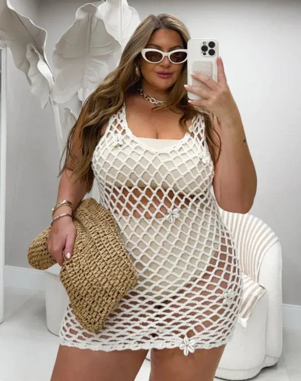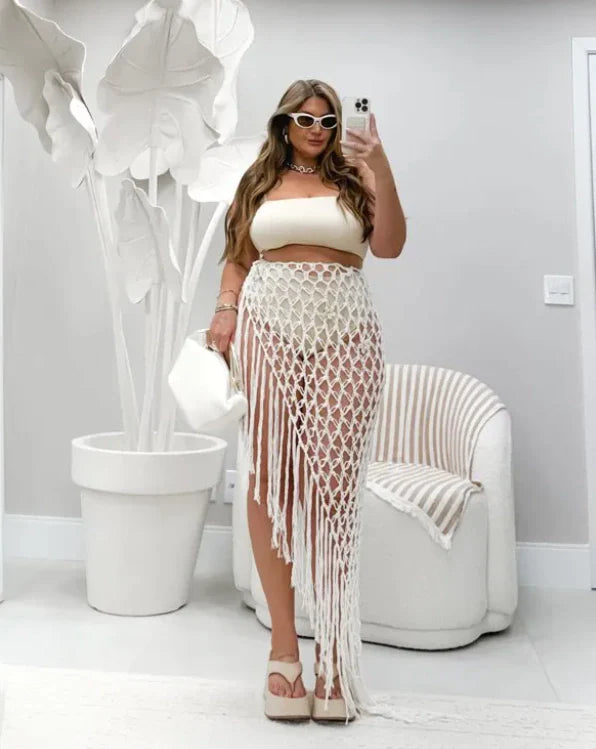 Na cor off white, o biquíni combina com saídas de praia em crochê, chapéus de aba larga e rasteiras naturais — para uma composição leve, chique e cheia de personalidade.