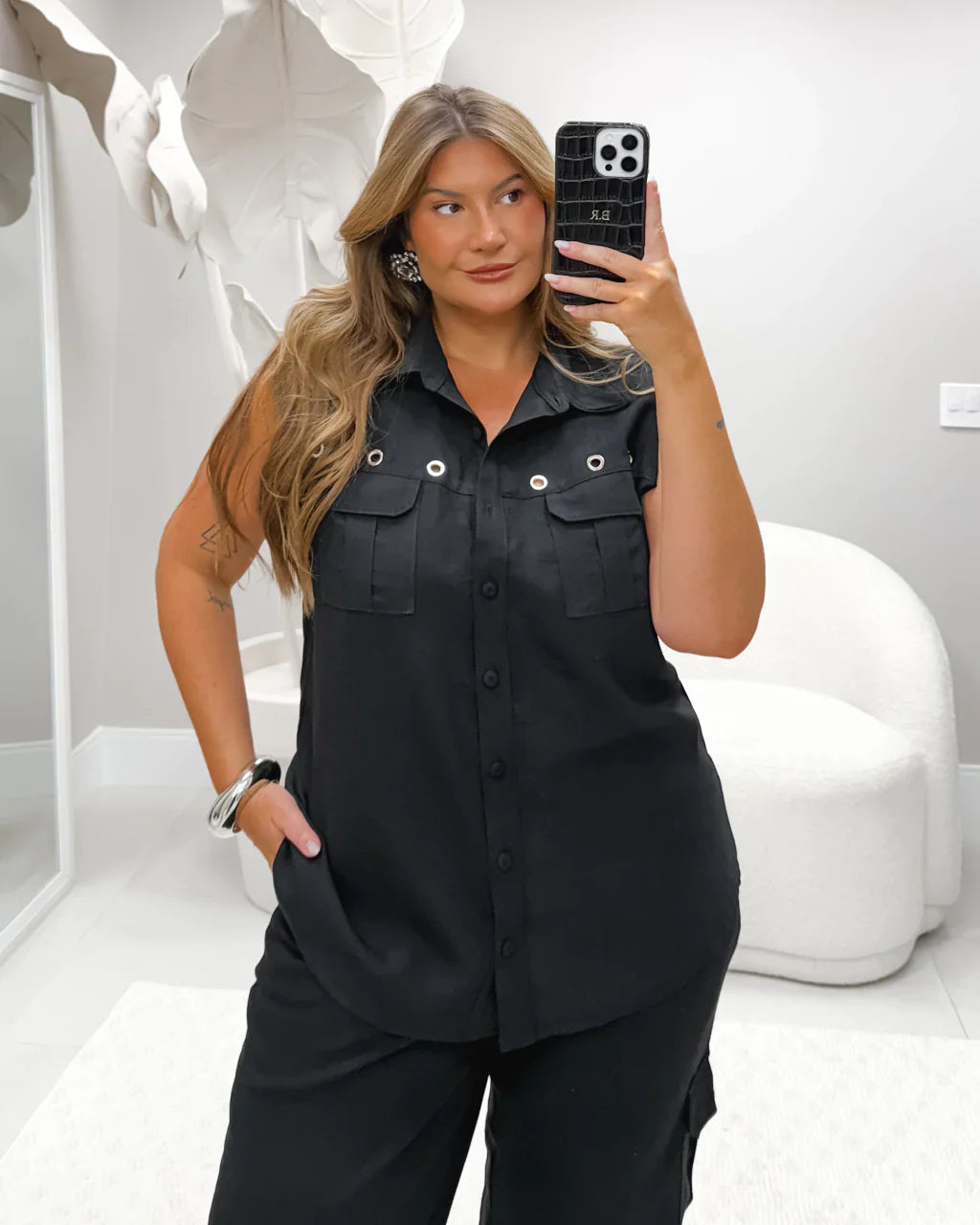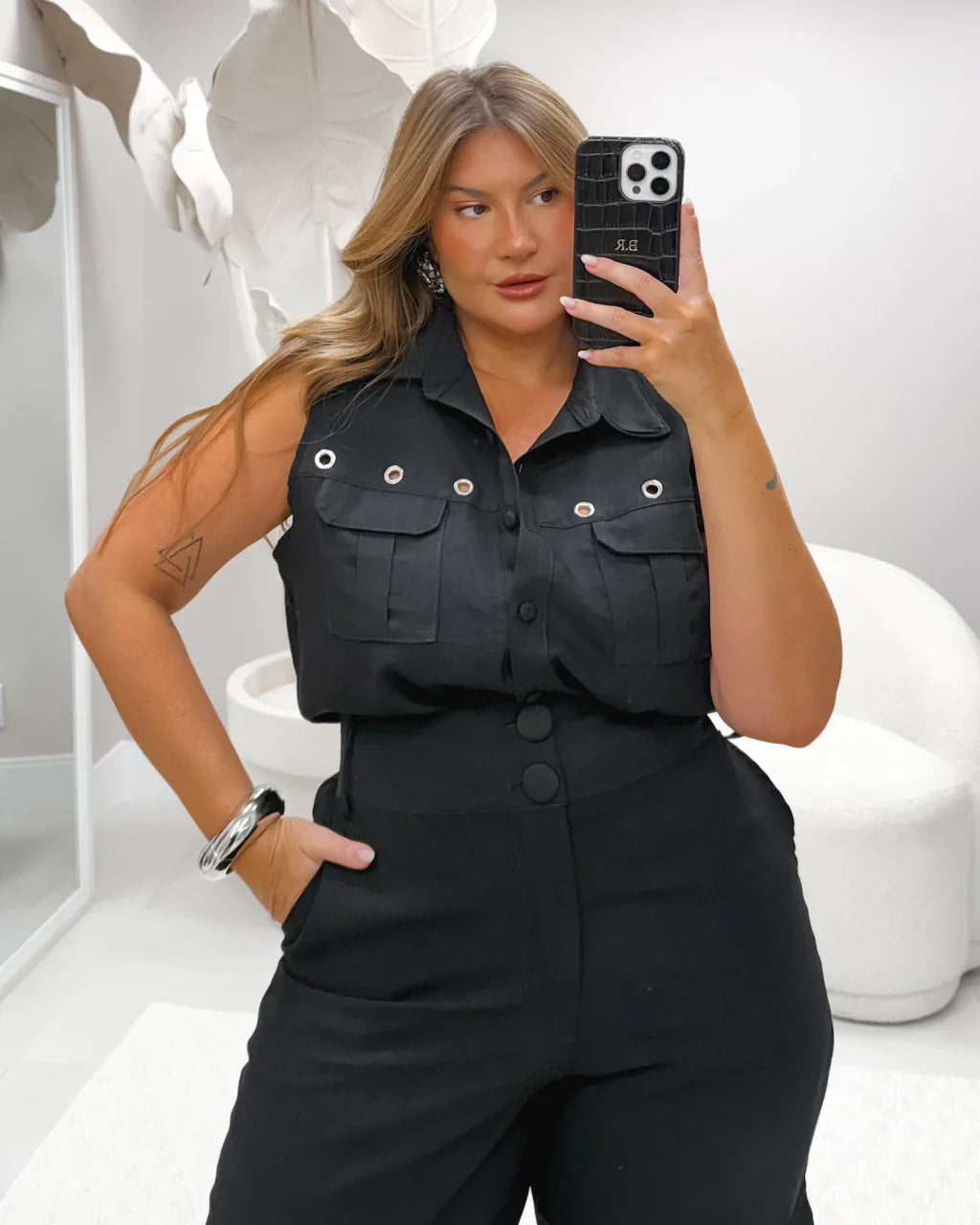 Quando a alfaiataria se encontra com a ousadia, nasce esse conjunto poderoso! A blusa sem mangas tem um caimento fluido e acabamento refinado, enquanto a calça wide-leg alinha sofisticação e conforto para um visual elegante em qualquer situação. Os ilhós aplicados adicionam um toque urbano e atual, perfeito para quem ama moda com personalidade.