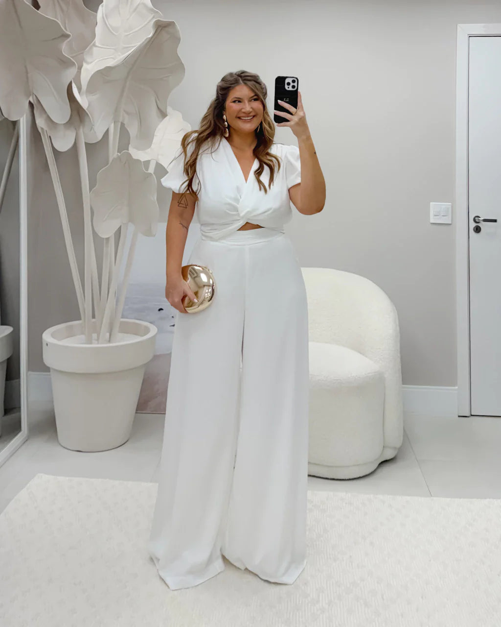 Modelagem: Longo, com decote transpassado, nó frontal e pernas amplas
