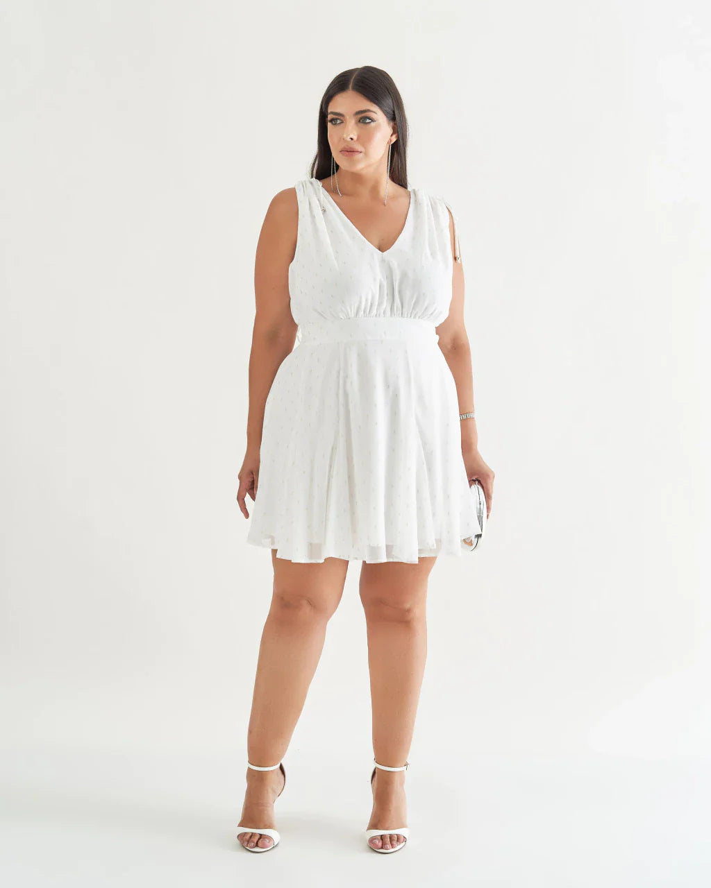 - Modelagem curta com saia evasê e decote delicado