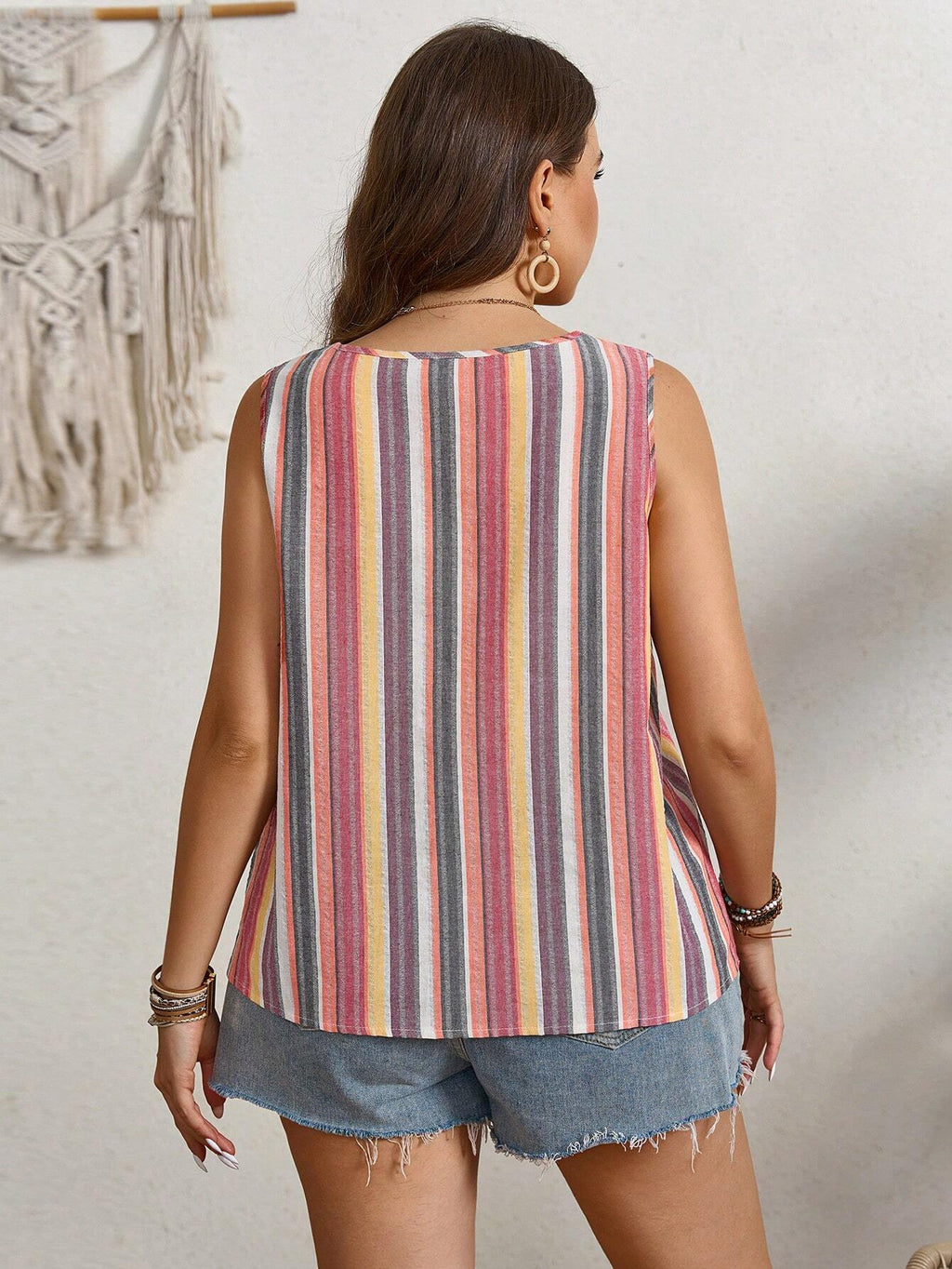 Estilo: Casual Detalhes: Assimétrico Gola: Gola Assimétrica Detalhes: Botão Tipo: Top Cor: Multicolorido Estampa: Listrado Comprimento da Manga: Sem Mangas Comprimento: Regular Caimento da peça: Ajuste Regular Tecido: Não elástico Material: Lã penteada Composição: 65% Poliéster Composição: 35% Algodão Instruções de manutenção: Lavagem de máquina ou lavagem profissional a seco Translúcido: Não