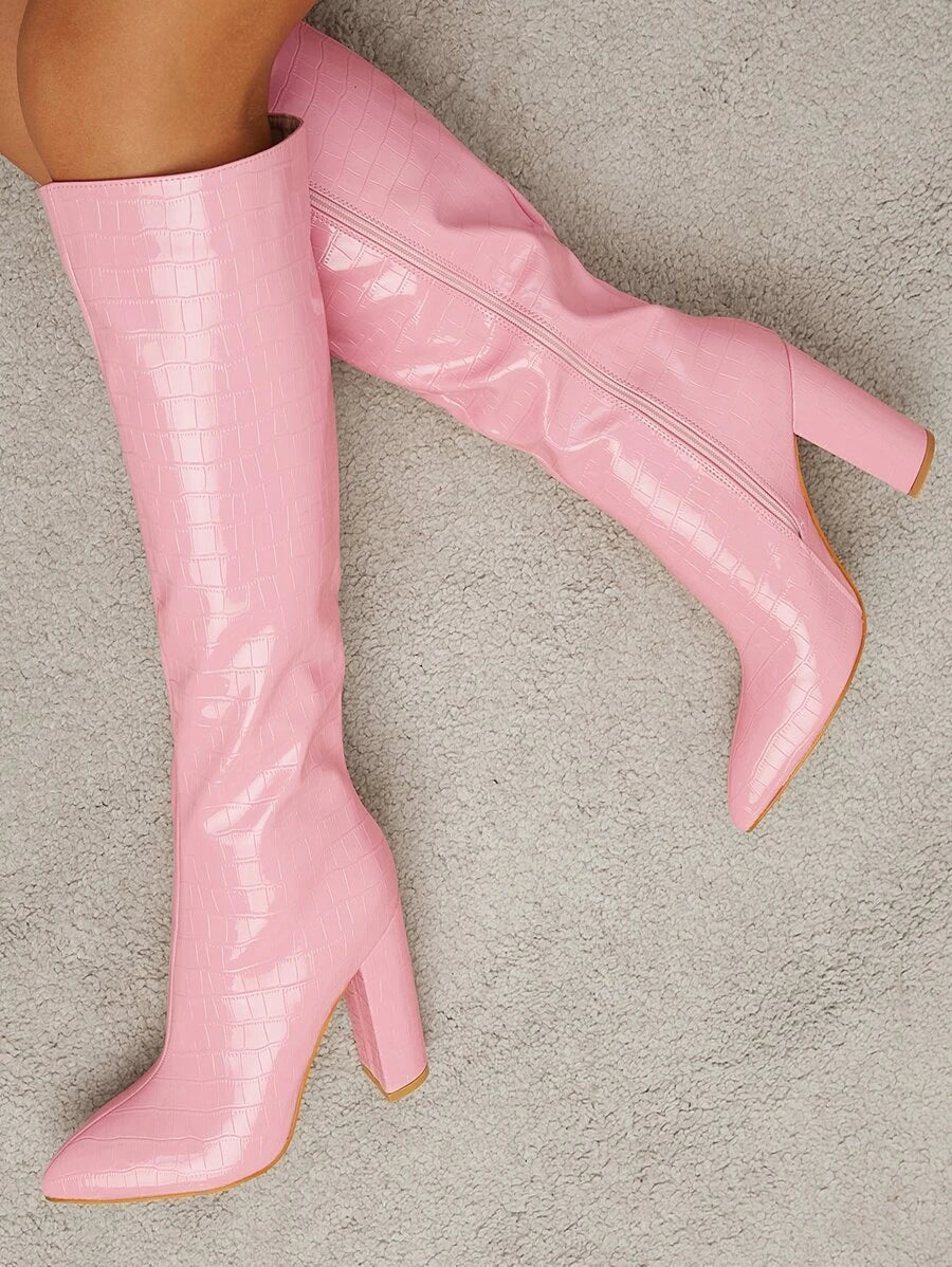 Descrição Tipo de Fechamento: Zíper lateral Cor: Rosa chiclete Altura do salto: Salto alto Tipo de altura das botas: Botas de Joelho Material da parte superior do calçado: Couro PU Material de revestimento: Couro PU Material da palmilha: Poliéster Material da Sola: Borracha