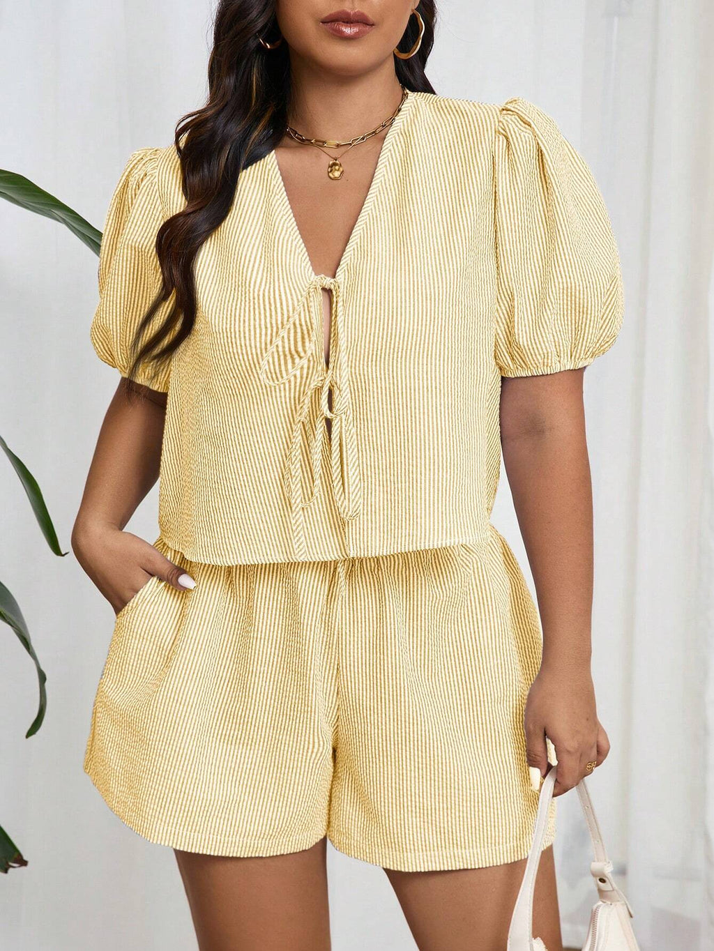 Conjunto Plus Size Listrado de Verão com Camisa e Shorts Beatriz
