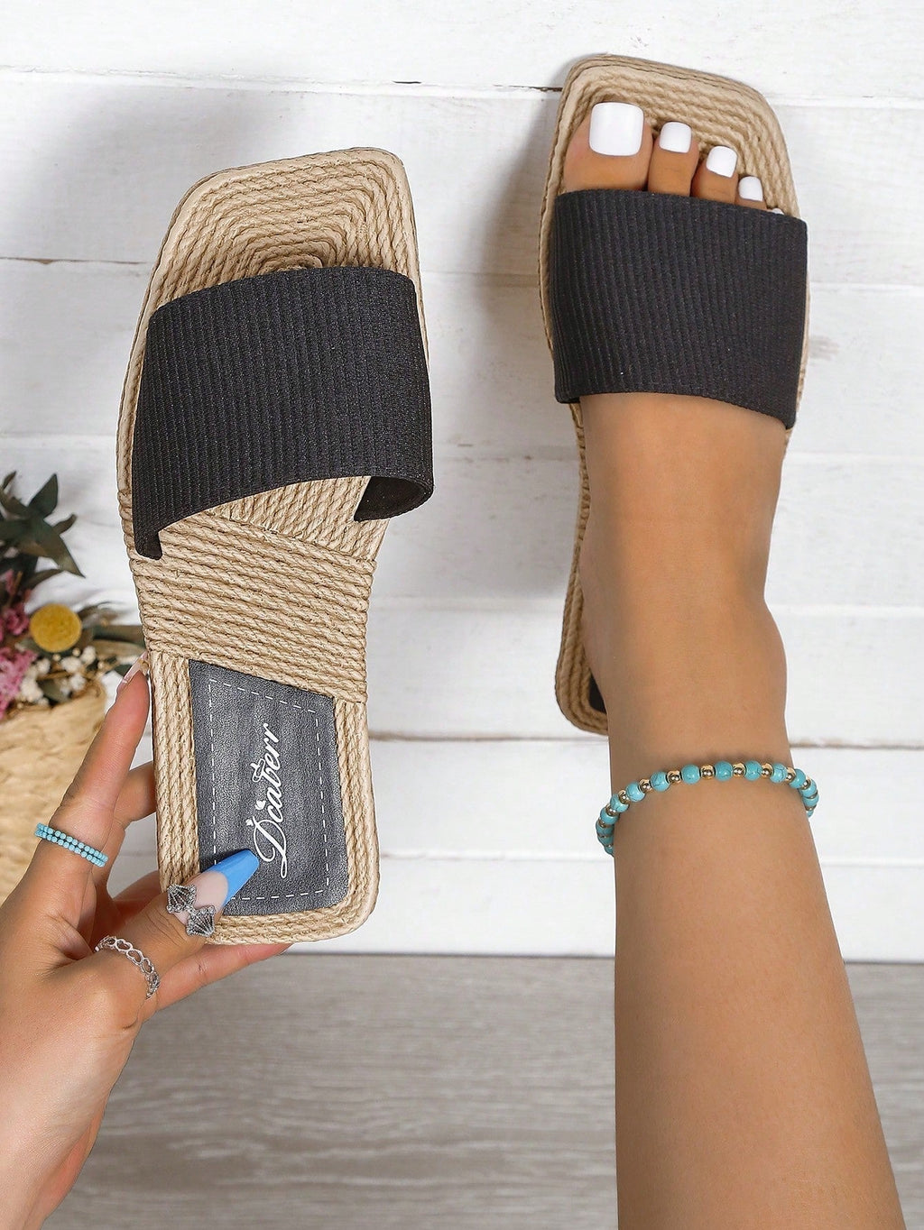 Cor: Bege Altura do salto: Plano Medidas: Um tamanho menor Material da parte superior do calçado: Tecido Material de revestimento: Tecido Material da palmilha: EVA Material da Sola: EVA