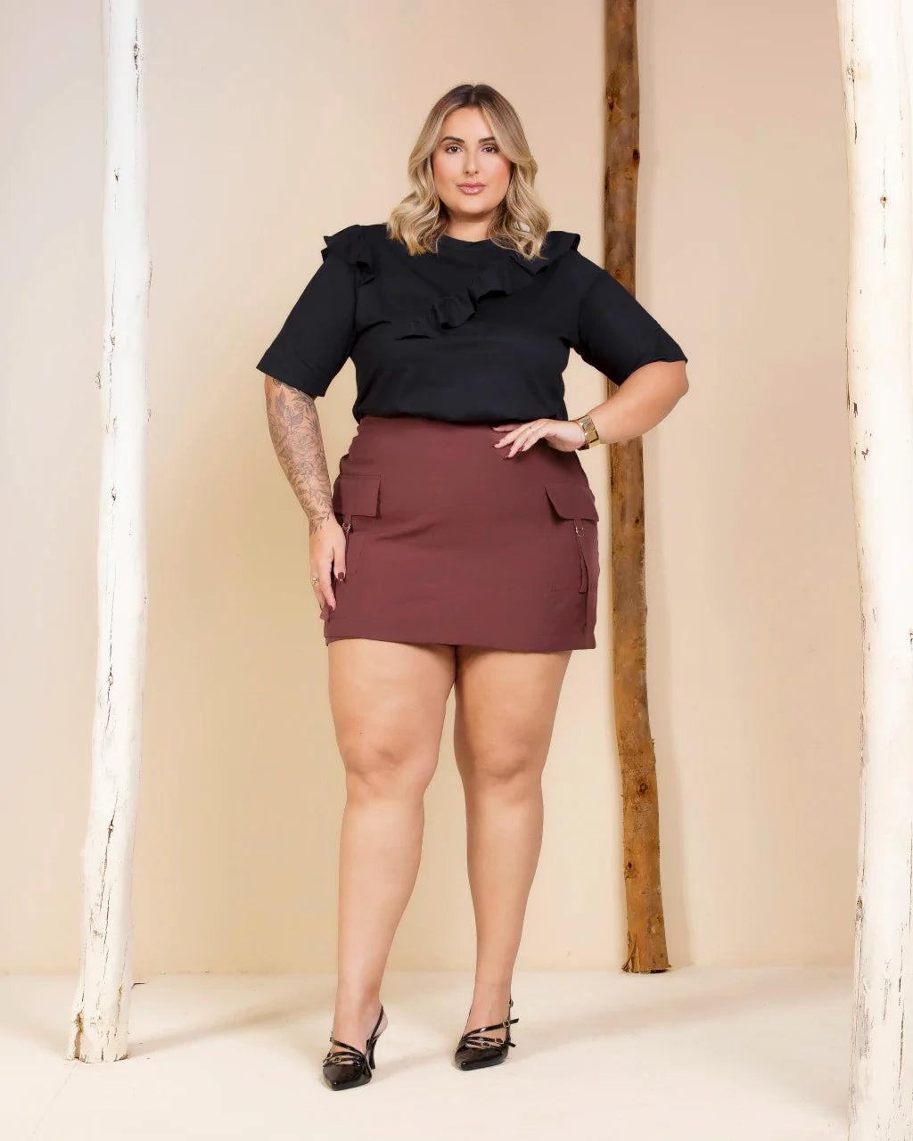 O detalhe de babados adiciona feminilidade e delicadeza à peça, tornando-a adequada para diferentes ocasiões, desde passeios casuais até encontros informais. Fácil de combinar, harmoniza perfeitamente com saias, jeans ou calças de alfaiataria, criando looks modernos e elegantes.